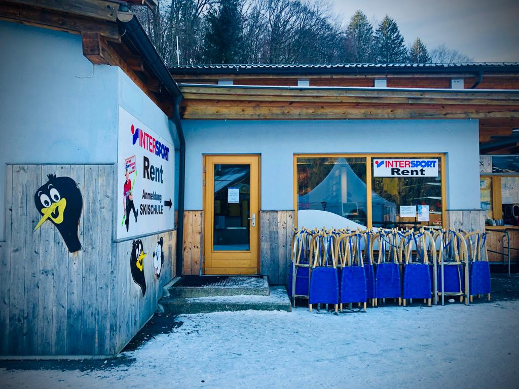 Intersport-Skiverleih-Werbung mit Skifahrer auf verschneiter Bergpiste.